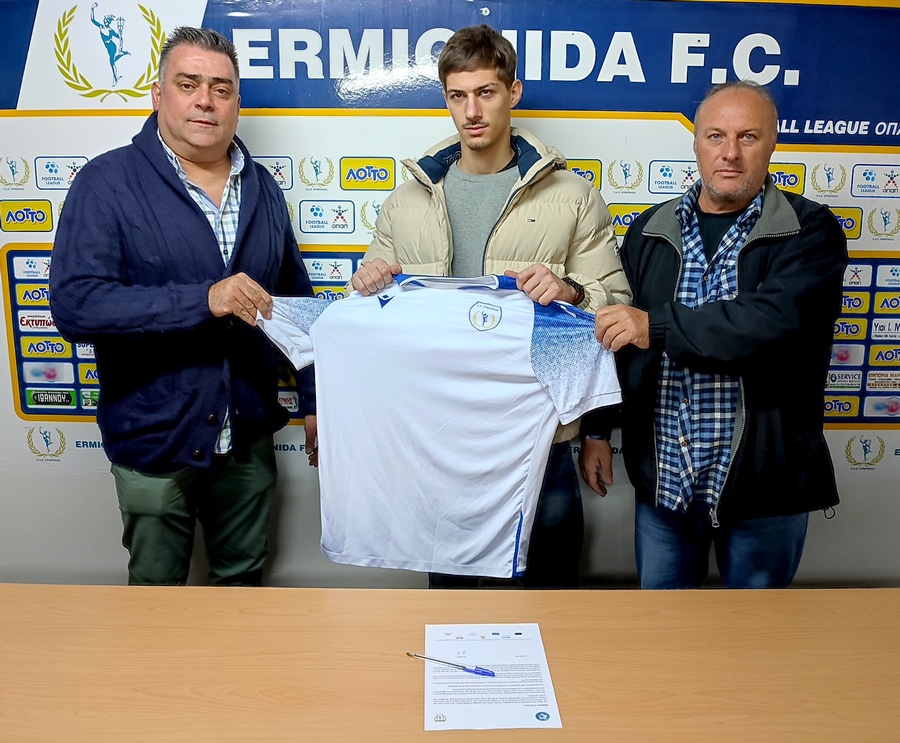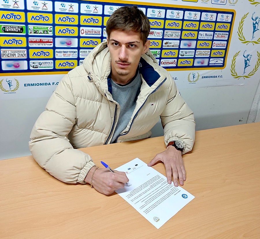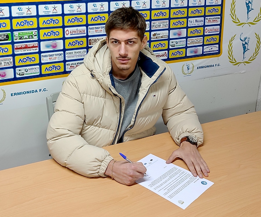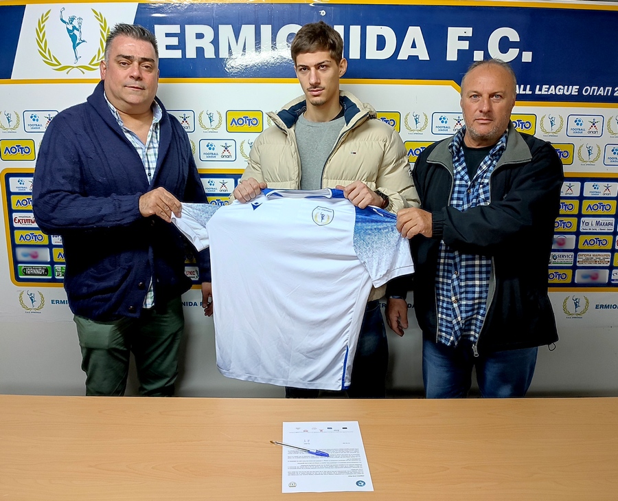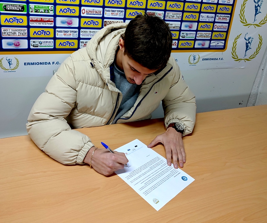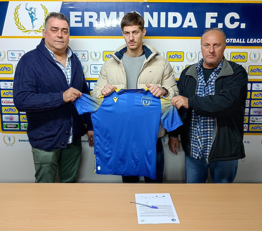 Ο Θεοδόσης Γκαμάνης υπέγραψε το συμβόλαιό του με την ΑΕ Ερμιονίδας παρουσία του προέδρου Χρήστου Ντούβα και του Φραντζέσκου Δημαράκη (μέλος του ΔΣ), από τους οποίους παράλαβε και τη νέα του εμφάνιση: